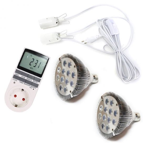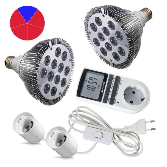 - Лампы Биколор 36Вт – 2 шт. Лампа Биколор излучает два эффективных спектра, которые являются основой, необходимые для фотосинтеза растений. Это спектры: красный 660нм и синий 450нм (в пропорции 9:3). Это оптимальное универсальное соотношение красного и синего спектра для роста молодых растений и досветки взрослых.